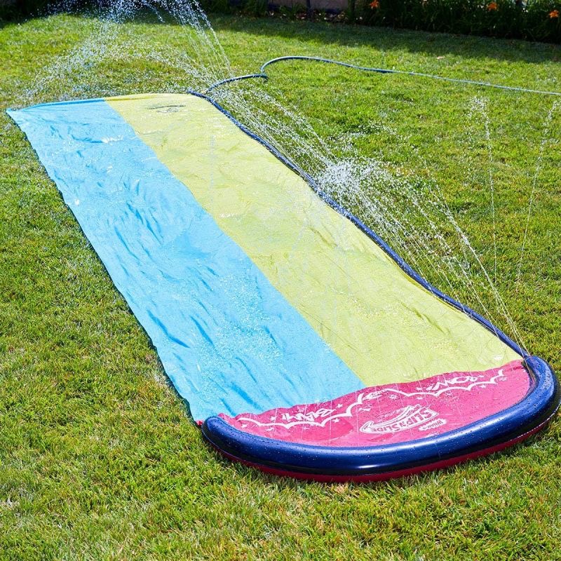 Trysky na obou stranách skluzavky zajišťují nepřetržité pokrytí vodou od začátku až do konce. Stačí připojit zahradní hadici a pořádně se namočit!