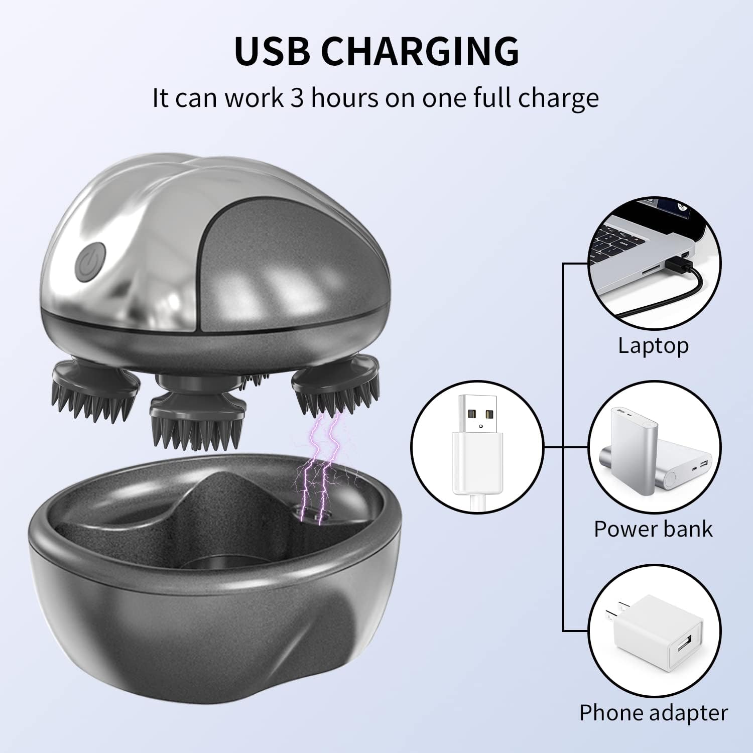SCALP je bezdrátový, snadno použitelný, rychlé nabíjení umožňuje až 2 hodiny masáže. Je ideální pro relaxaci doma, v kanceláři nebo na cestách. S přiloženou USB nabíjecí stanicí si jej můžete vzít kamkoli. 📦🔌